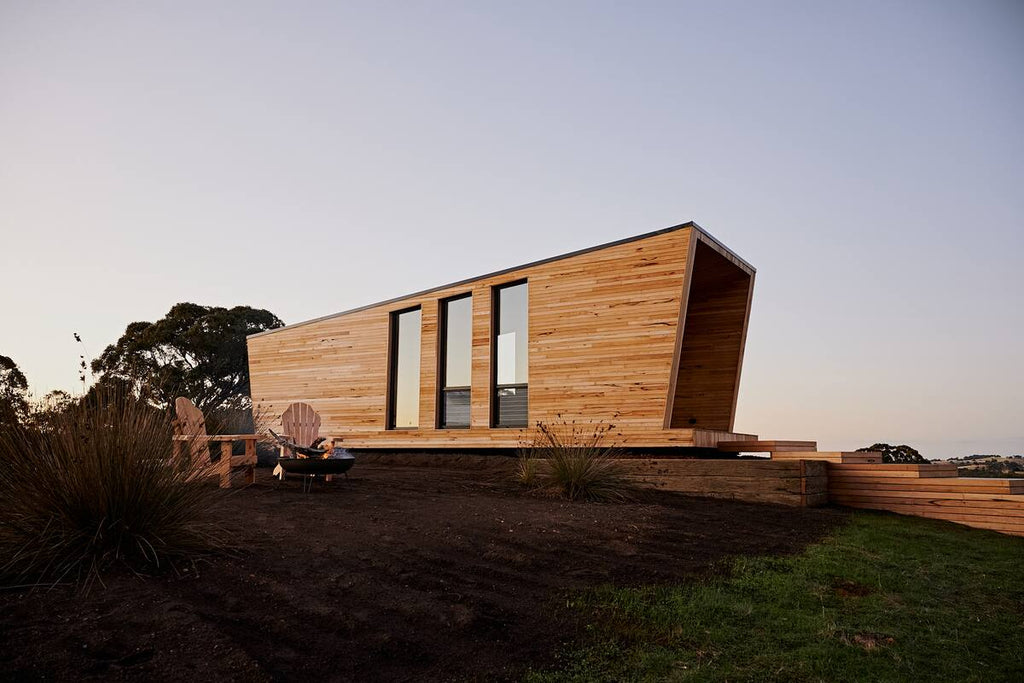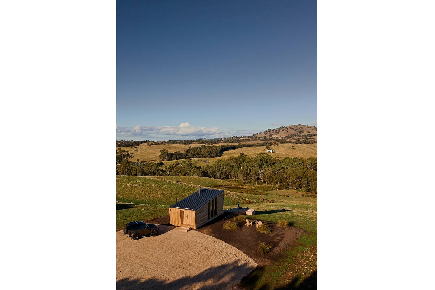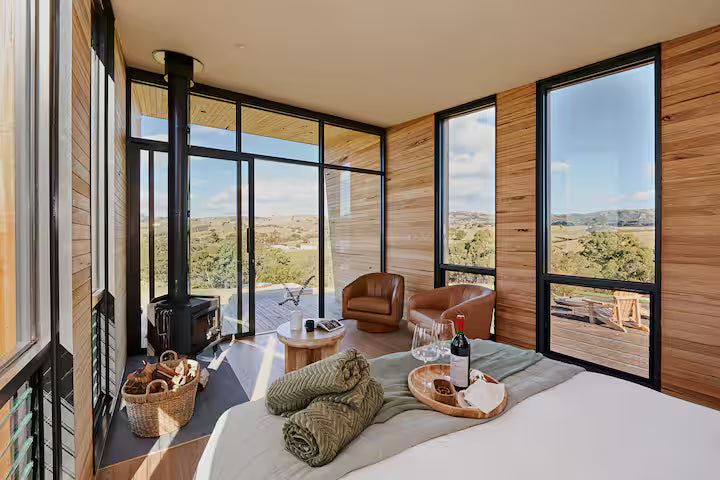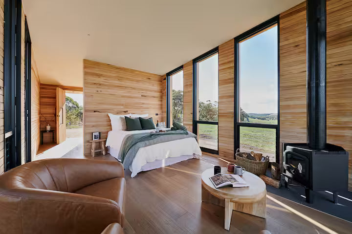 Inside, a light-filled retreat awaits β expansive windows bring the outdoors in, offering ever-changing views of gum trees, misty mornings, and golden sunsets. A crackling log fire keeps the space cosy all year round, while earthy textures and soft lighting create a soothing, grounded atmosphere.